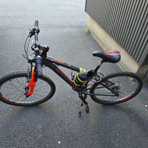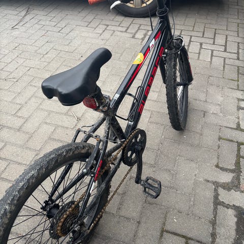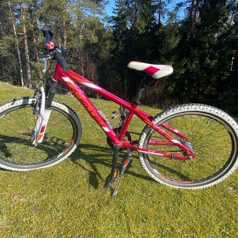 Scott terrengsykkel for barn med 24" hjul. Sykkelen har svart ramme med blå detaljer og dempegaffel foran. Utstyrt med gir bak, felgbremser foran og bak, samt grove dekk som egner seg til både asfalt og lett terreng. Sete og styre er tilpasset barn for en mer oppreist sittestilling. Passer som juniorsykkel til hverdagssykling og turbruk. Bærer preg av hverdagsbruk til skole og trening 😊