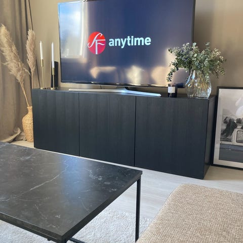 Bestå tv benk 180 cm med Björköviken/brun beiset eikefiner. Har også noen lysegrå dører/skuffefronter, disse kan medfølge til en rabattert pris eller kjøpes separat.