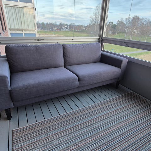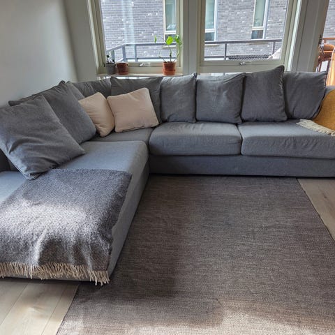 Godt brukt, trenger en vask. Alle putetrekk kan taes av å vaskes. Har katt i hus. Myk og god sofa. Mål: 272×238. Står i 1. Etasje, må hentes kjapt, helst i morgen torsdag 9.april