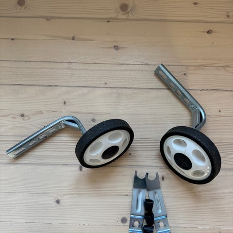 Støttehjul til barnesykkel i svart metall med hjul i plast/gummi. Settet består av to støttehjul som monteres på bakakslingen på en barnesykkel for ekstra stabilitet under sykling og læring. Egnet for sykler som har festehull for denne typen støttehjul.
