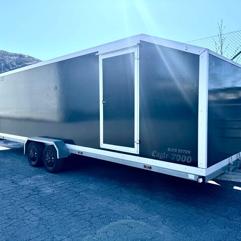 Lukket skaphenger med to aksler og svart ytre. Hengeren har 2 sidedører og bakluke som kan brukes som kjørerampe. Innvendig er det hvite vegger og et gulv tilpasset inn- og utkjøring, for eksempel av kjøretøy eller utstyr. Egnet for transport og lagring der last ønskes beskyttet mot vær og innsyn.