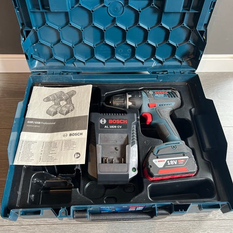 Bosch Professional GSB 18V-60 C slagdrill 18V i blå/svart utførelse. Modellen har børsteløs EC-motor og er en del av Bosch sitt 18V-system. Maskinen har to hastigheter, frem-/reversfunksjon og justerbar momentinnstilling. Egnet til boring og skruing i tre, metall og murverk med passende bor og bits drill 4-5 år men lite brukt.. Batteri er så og si helt nytt nesten ikke brukt.