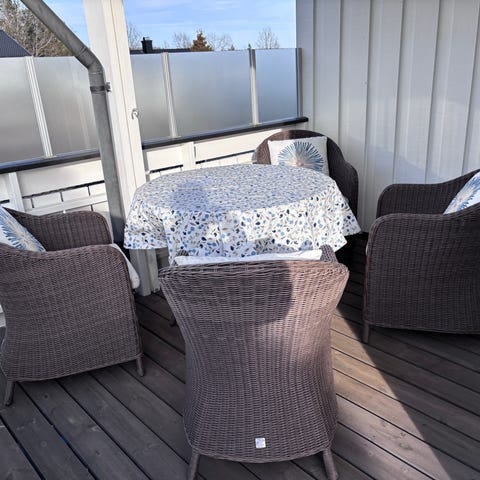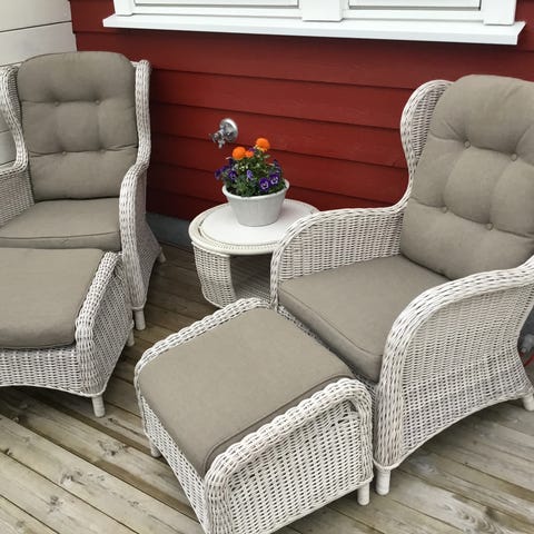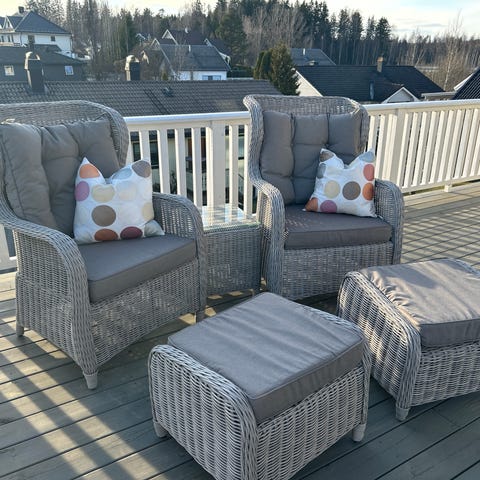 Består av to stoler med hver sin skammel, et rotting bord med glassplate.