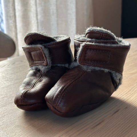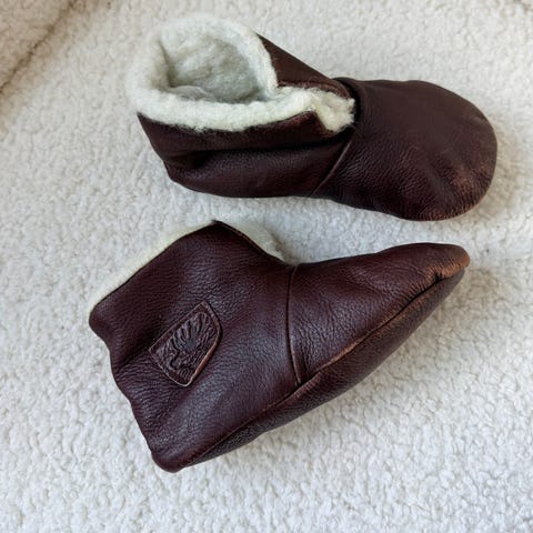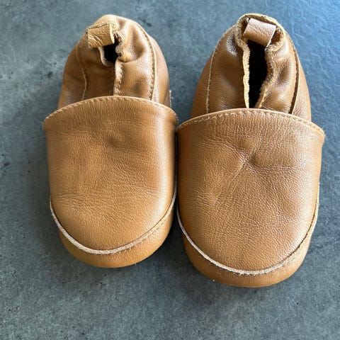 Skinntøfler til baby/små barn selges. Noen merker i skinnet, men ingenting sjenerende. Sendes mot at kjøper betaler frakt 🌸