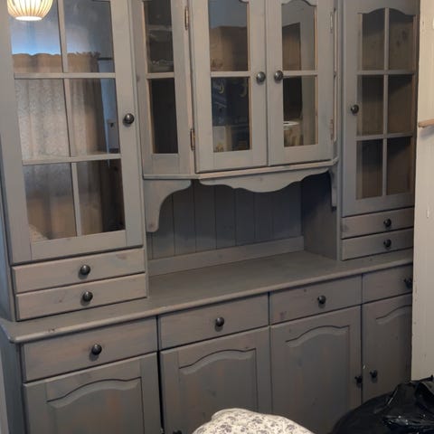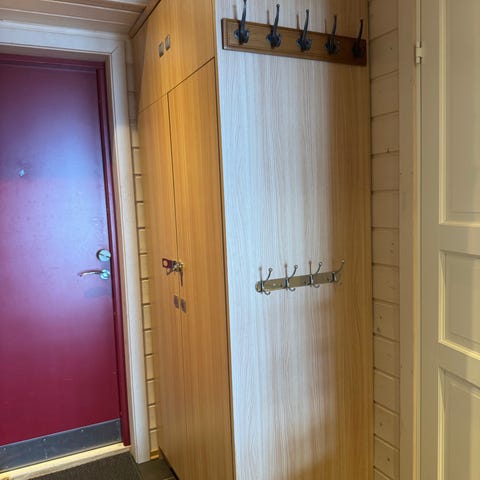 Furu/tre med rød stripe i ruter på dørene.