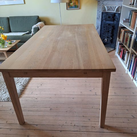 Pent bord i hel tre med mulighet for å forlenge bordet. Lyst tre. Platen for å forlenge er 40cm, så bordet kan bli hele to meter langt.