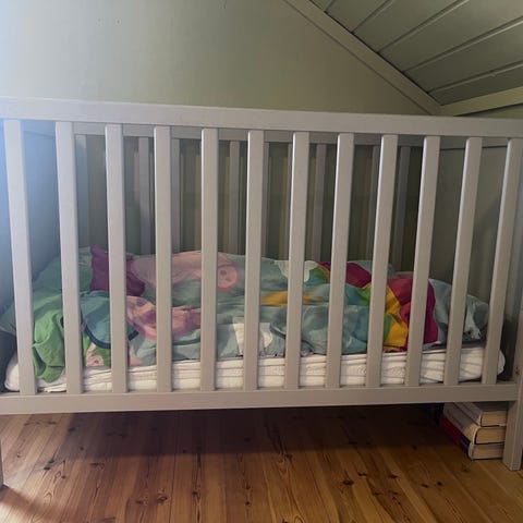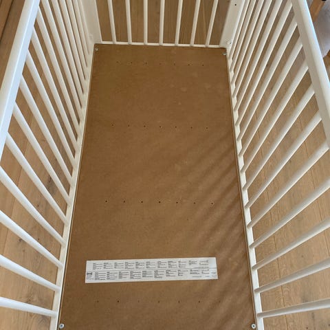 IKEA sprinkelseng i hvit farge og justerbar bunn. Passer standard madrass til sprinkelseng (ikke inkludert). Noe slitasje på lakken kan forekomme, se bilder for detaljer om tilstand.