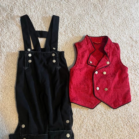 Småtroll bunadsett for gutt i størrelse 92-98. Sett i flerfargede tekstiler bestående av svart bukse med seler og dekorative knapper, rød vest med detaljer, hvit skjorte og mørk lue. Luen er str 2-6 år.