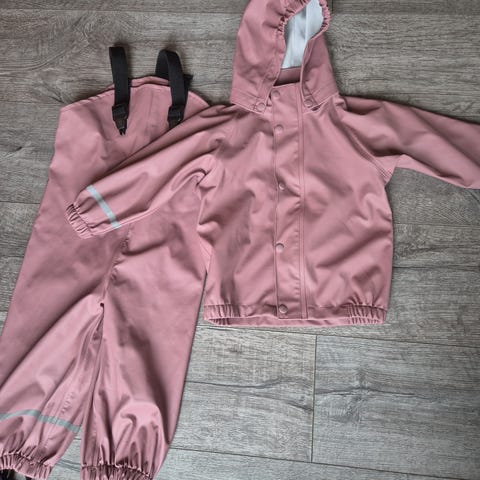 I god stand Helly Hansen regnsett. Eneste refleksen på ene foten som er falt av bak og litt foran.