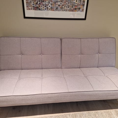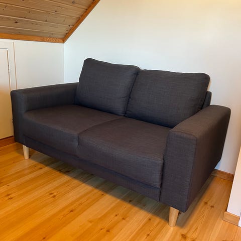 Super billig sovesofa; innvendig bredde 200cm x 140cm. Material ull, mörkt grå. Avtagbar för vask.