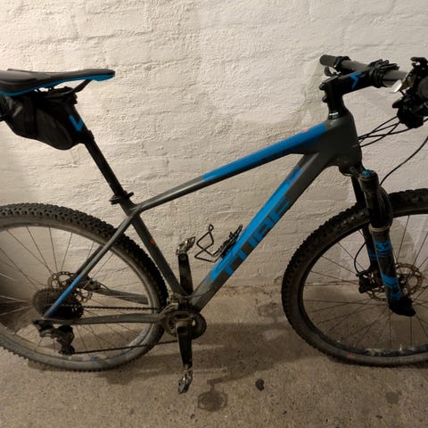 Cube terrengsykkel for herre i størrelse M med 29" hjul. Sykkelen har dempegaffel foran, rette styre med røde holker og kraftige terrengdekk tilpasset grus og sti. Rammen har flaskeholder og feste for lås. Passer til hverdagssykling og turer i lett til middels terreng.