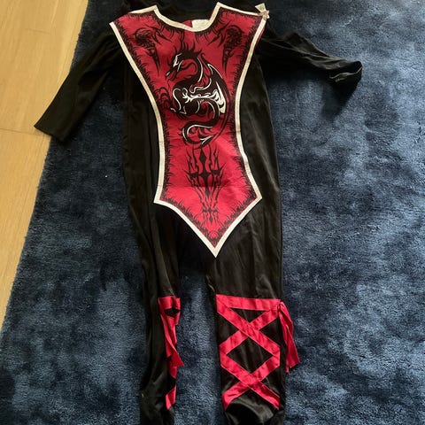 Kult ninja-kostyme med grønne ermer og mørke detaljer, med tøft trykk foran. Ser veldig leken og karaktersterk ut. Brukt å har nupper i seg å har nåken trå som stikker ut. Men fortsatt like fin til å bruke for å ha det litt kjekt