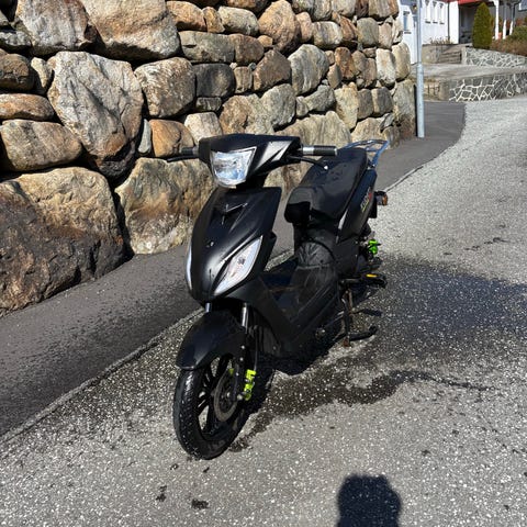 Kudaki VenturePro elektrisk scooter i svart farge. Scooteren har lav innstigning, bred fotplate og sete med plass til én person. Den er utstyrt med lykter foran og bak, blinklys, speil og støtte. Bak finner du bagasjebrett med toppboks. El moped har nettopp hatt full service på bremser og er i god stand.