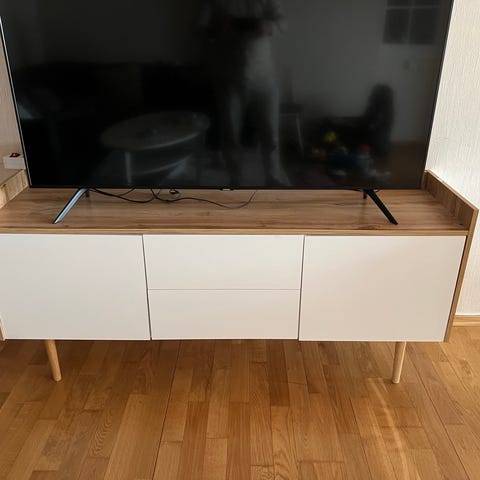 Hvit TV-benk fra BoConcept selges. Håndtak og bein i heltre eik. Ingen store bruksmerker. Fremstår som ny.