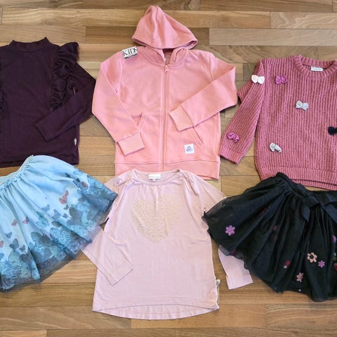 Pakken inneholder 4 basisgensere i grønn, rosa og lilla. I tillegg til lilla fleecegenser med glidelås og volangdetaljer, samt tilhørende fleecebukse.