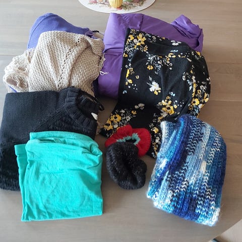 Inneholder: 3 jakker - rød og lilla fra Skogstad , 1 kjole , 1 genser , 1 bluse , 1 t-skjorte , 1 par kosesokker. 1 pannebånd med refleks 1 scrunchies / hårstrikk