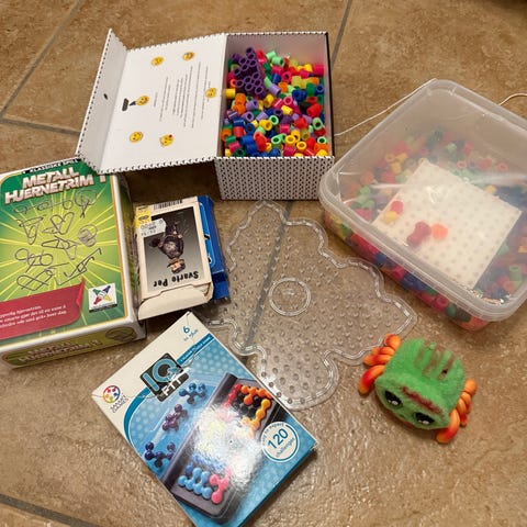 Settet inneholder ulike farger strykeperler i løse poser og beholdere, samt flere perleplater i forskjellige former, blant annet dyr, figurer og geometriske former. Egnet til kreative hobbyprosjekter for barn, som å lage motiver som kan strykes og brukes som pynt eller små figurer.