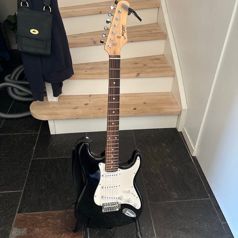 Grei elguitar selges, ettersom den ikke blir brukt. Kjøpte brukt tidlig i 2025, brukt litt, latt stå siden.