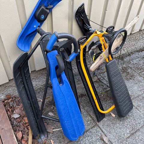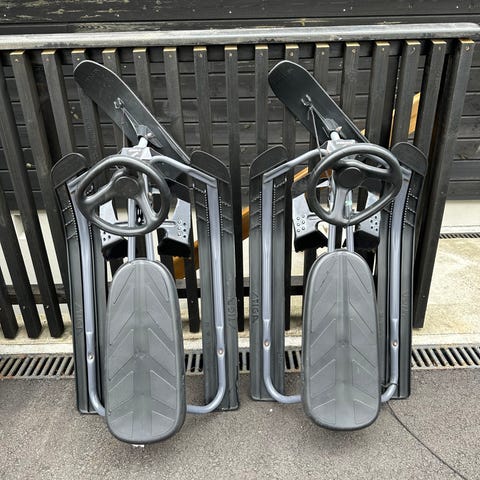 Stiga rattkjelke i rød og svart farge. Kjelken har rattstyring og bremse, samt sete og ski i plast. Egnet for barn til bruk på snøføre og akebakker.