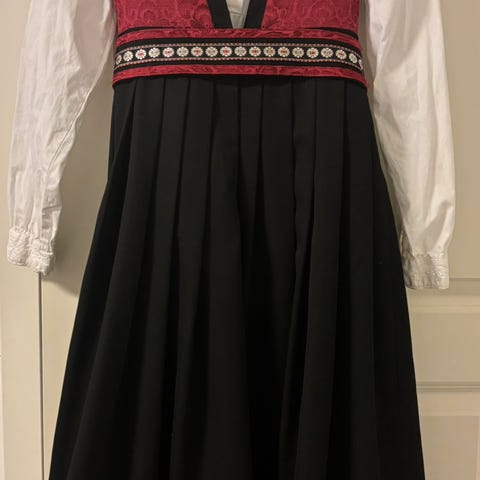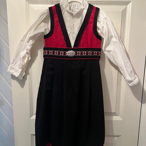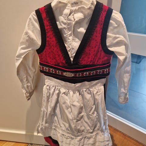 Skjorten er i 100% bomull. Kjolen/stakken er i polyester. Jeg synes festdrakten er litt stor i størrelsen.