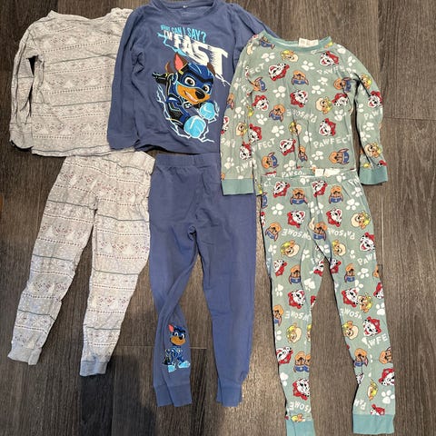 pysjamas for gutt i størrelse 128. Sett i bomull med flerfargede deler. Bildet viser to ulike pysjamassett med langermet overdel og lange bukser. Egnet som nattøy for barn i aktuell størrelse.