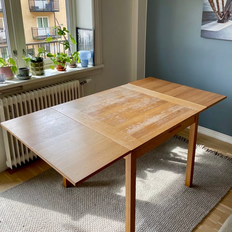 Nydelig lite kjøkkenbord i tre. Bordet har klaffer som gjør at du kan justere størrelsen, og en praktisk liten skuff for enkel oppbevaring. Beina er litt løse, så bør limes for bedre stabilitet. Selges på grunn av flytting.