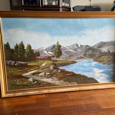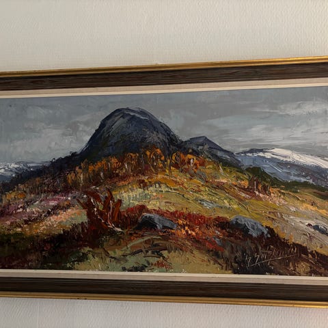 Landskapsmaleri i olje på lerret med motiv av natur og trær. Bildet er utført i kraftige penselstrøk og har dempede naturfarger som grønt, brunt og blått. Maleriet er innrammet i en lys, profilert treramme. Signatur er synlig nede i venstre hjørne. Egner seg som veggdekor i stue, gang eller andre oppholdsrom.
