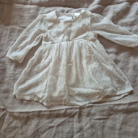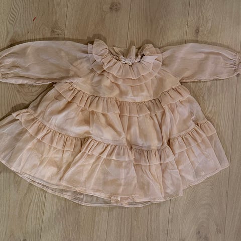 MarMar Copenhagen bodykjole for jente i størrelse 68. Plagget er i beige bomull og har lange ermer. Kjolen har innebygd body med lukkning mellom bena, samt rysjekrage og knapp i nakken. Egner seg som hverdagsplagg eller til enklere penbruk for baby.