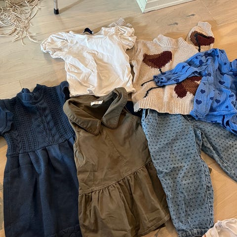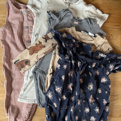 Alle plaggene er hele og rene. De er vasket og strøket. To av plaggene er str 86. Disse oppleves små og passer best i denne str gruppen.