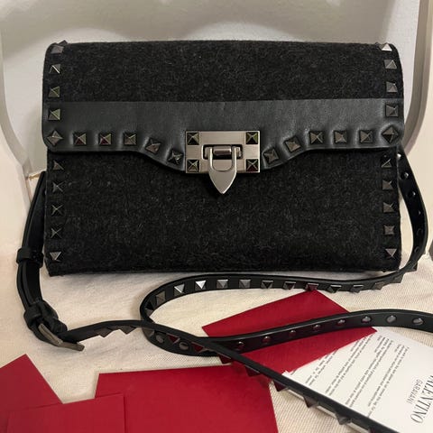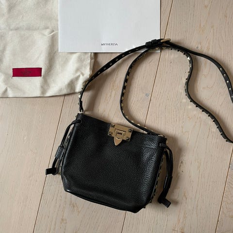 Valentino skulderveske i svart skinn og ikoniske nagler (med lang skulderrem). Vesken er brukt, men holdt seg veldig fin! Fra 2019 ✨
