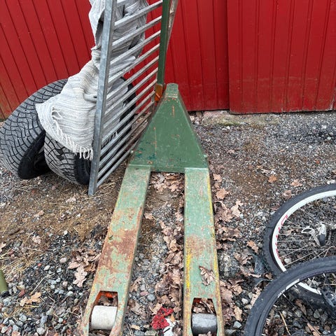 Palleløfter i gul farge med manuell løftemekanisme. Utstyrt med styrehåndtak og doble hjul foran for stabil manøvrering. Egnet for intern transport og håndtering av paller på lager, verksted eller butikk. Standard gafler tilpasset europaller.