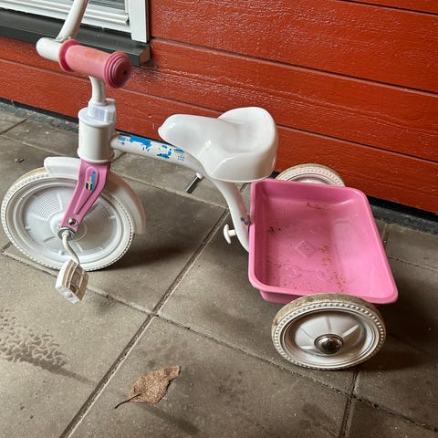 DBS trehjulssykkel for barn i rød farge. Bak har trehjulssykkelen et avtagbart lastebrett.