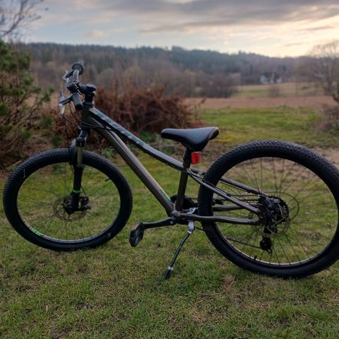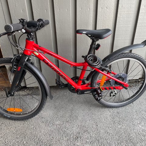 Trek barnesykkel med 24" hjul. Sykkelen har rød ramme med lav innstegshøyde og girbetjening på styret. Utstyrt med skjermer bak og grove dekk. Sykkelen har stått innendørs når den ikke har vært i bruk, derfor har ikke lakkfargen falmet.