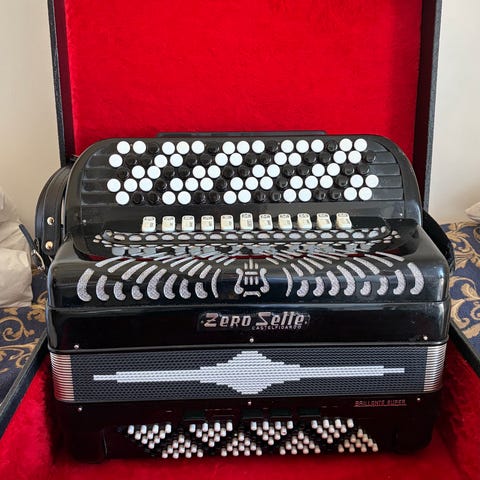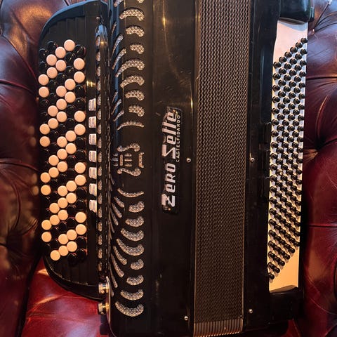 Excelsior Tosca trekkspill. Passer til både øving og framføring innen ulike musikksjangre der man ønsker et klassisk, akustisk trekkspill. Norsk system. Firkorig med falsk musette. Tidligere eier har kuttet av en del på master-"platen" på siden, dette er kun kosmetisk. Synlig brukte reimer, men i god stand. Koffert med fungerende låser. Mute. Passer fint for noen som vil oppgradere fra mindre, norsk system til 120 basser. Selger fordi jeg ikke bruker det lengre. Kjøpte brukt av trekkspilltrollene på Lambertseter. Pent brukt. Pris kan diskuteres. Veier 12,5 kg ifølge badevekta
