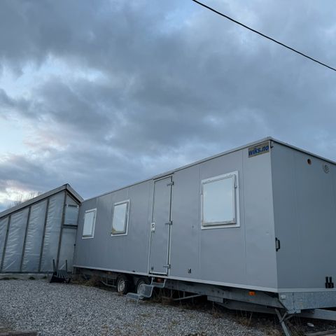 Enkel innvendig overflate i lyse paneler og fast gulv. Egner seg som midlertidig oppholdsrom, lager eller arbeidsbrakke på byggeplass eller tomt.