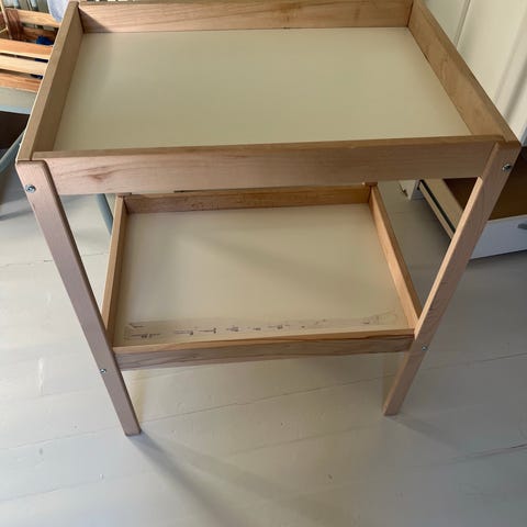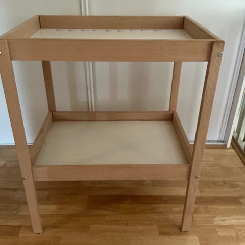IKEA stellebord i tre med to hvite stelleflater. Øverste del har forhøyet kant rundt for sikker og avgrenset stelleplass. Nederste hylle gir ekstra oppbevaringsplass til bleier, klær og utstyr. Åpen konstruksjon gjør det enkelt å komme til fra flere sider. Egnet til bruk på barnerom eller bad der det er behov for en fast stelleplass.