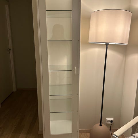 Pent vitrineskap fra IKEA. Hyllene i glass er flyttbare slik at skapet kan tilpasses etter behov. Skapet har uttak til ledning øverst, slik at det kan ha integrert belysning. Det må hentes på Tjuvholmen. Det er lagret i en bod i et garasjeanlegg, slik at det er enkelt å flytte det over i en bil.