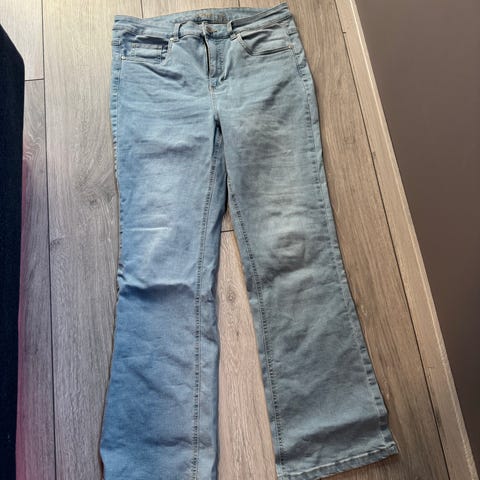ONLY jeans for dame i størrelse M med livvidde W32. Buksen er laget i denim og har grå vask. Klassisk femlommersmodell med beltehemper og glidelås med knapp i livet. Nederst på buksebena er det synlig slitasje og hull, som vist på bildene. Passer til hverdagsbruk eller som et plagg til tilpasning og redesign. Kjøpt for 500kr.
