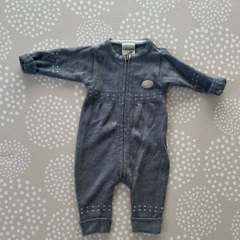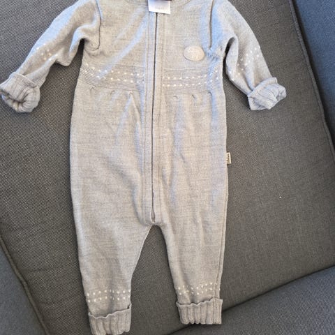 Lillelam ulldress i merinoull i størrelse 74, unisex. Dressen er grå og har glidelås i front for enkel av- og påkledning. Den har lange ermer og ben, samt ribbekanter ved håndledd og ankler for bedre passform. Ulldressen passer godt som innerste eller mellomste lag til baby og småbarn i kjøligere vær.