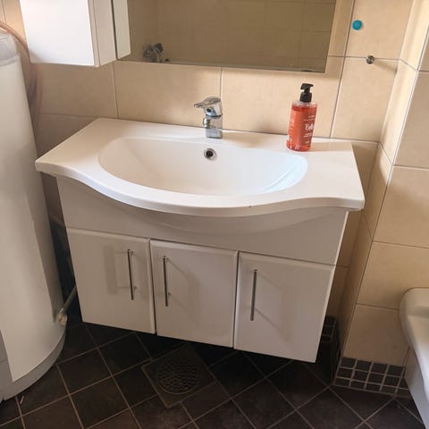 Selve vasken har det kommet ett knust hakk, derfor selges den så billig (viser til bilde).