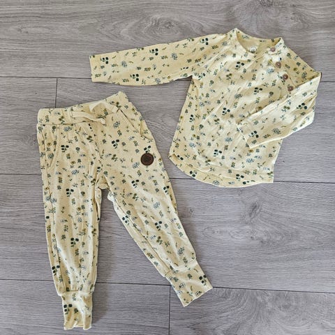 Gullkorn sett barneklær for jente i størrelse 128. Settet består av genser og bukse i matchende grønnfarge med mønster. Mykt og behagelig materiale egnet til hverdagsbruk, lek og innebruk.