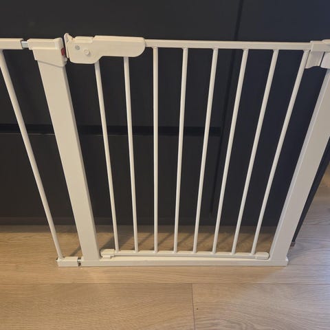 Hvit sikkerhetsgrind i metall. Består av vertikale spiler og festeanordninger for montering i døråpning eller trappeåpning. Grindens konstruksjon er laget for å hindre at små barn eller kjæledyr passerer mellom rom. Leveres med monteringsbeslag som vist på bildene. Egnet til innendørs bruk der det er behov for avgrensning av områder.