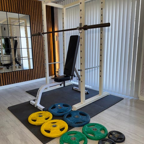 Squat rack med justerbar benk og totalt 100 kg vekter