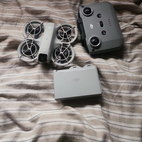 DJI Neo drone med tilhørende fjernkontroll. Dronen har kompakt design med propellbeskyttere rundt alle fire propeller. Flymore Combo inkluderer drone, fjernkontroll, ekstra propeller, verktøy, lade-/datakabel og ladestasjon/batteriholder. Har vært flydd svært lite og selges fordi den ikke brukes.