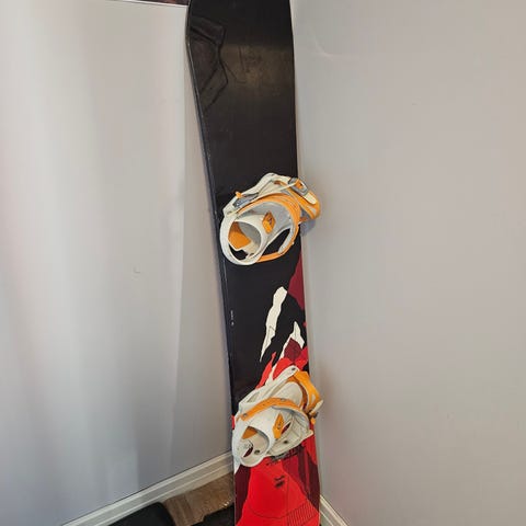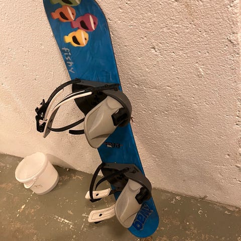 Snowboard med bindinger i svart. Brettet har blå underside med grafisk motiv. Junior. Fraktebag kan kjøpes i tillegg for 300kr