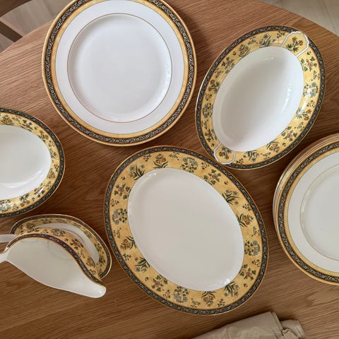 Selger et meget pent og klassisk kaffeservise fra kvalitetsmerket Wedgwood i mønsteret Cantata. Dette er et tidløst servise i ekte engelsk beinporselen (Fine Bone China) som ble produsert på 90-tallet.