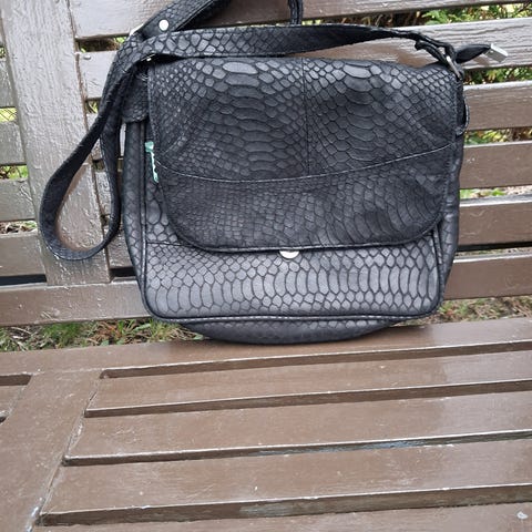 Stilren veske i ekte skinn i olivengrønn farge. Kompakt, men romslig – passer til hverdagsbruk. Justerbar skulderrem og glidelåslukking.