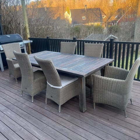 Settet er pent brukt og i god stand, perfekt for hyggelige måltider ute på terrassen i sommer. Bordet har hull i midten til parasoll.