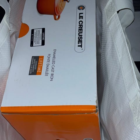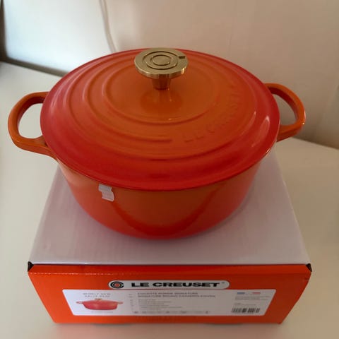 Le Creuset Signature rund gryte i støpejern med diameter 28 cm. Farge oransje (Cerise/Volcanic-lignende nyanse) med kremfarget emalje på innsiden og rustfritt stålhåndtak på lokket. Gryten har to sidehåndtak og emaljert innside som er beregnet for jevn varmefordeling og enkel rengjøring. Egnet til bruk på de fleste koketopper, inkludert induksjon, samt i stekeovn innenfor angitte temperaturgrenser fra produsenten. Passer til tilberedning av gryteretter, supper og annen matlaging som krever jevn varme og lang tilberedningstid.