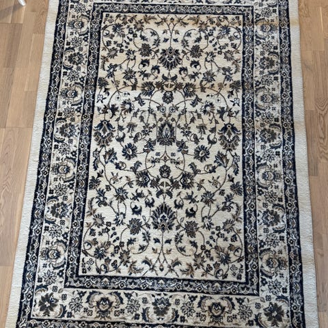 Pent brukt Chambord-teppe, maskinlaget i Belgia. Materiale: 100 % Exellan-fibre (høy tetthet syntetisk polypropylen), 1 000 000 punkter/m². Stilrent og elegant tradisjonelt design i krem/beige med sort bord. Mål: 160×230 cm.